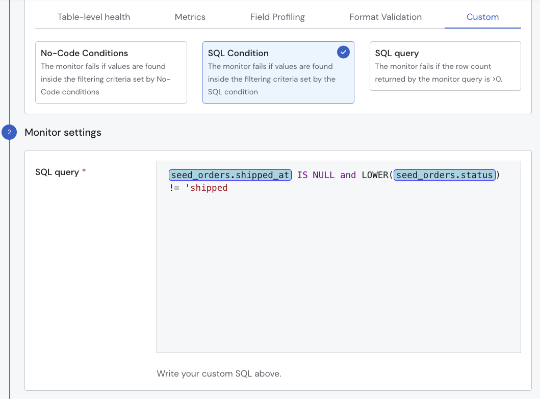 SQL Condition Custom Monitor: For complex logic that goes beyond our No-Code Condition builder, the new SQL Condition monitor allows you to define failure criteria using a SQL boolean expression. If a row evaluates to TRUE, an anomaly is triggered.