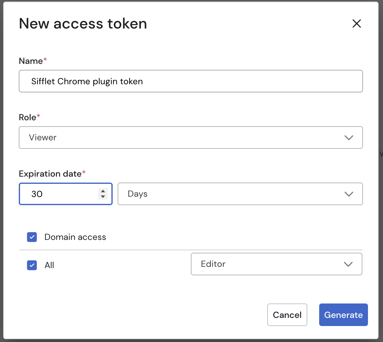 Select the domainsyou want this token to apply to, and assign a[domain role](https://docs.siffletdata.com/docs/access-control)for each domain (Viewer, Editor, Monitor Responder, Catalog Editor, etc.).- You can combine multiple domains with different roles in a single token.