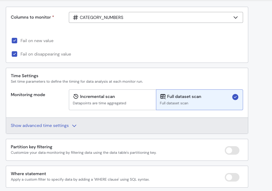 - Fail if category disappears – The monitor will fail if an expected category (or combination of categories) is missing from the data.