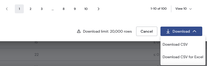 Download row number limitThere's a limit of 20,000 rows imposed on the number of lines included in the CSV file. If a list length exceeds the limit, it'll be truncated and only the first 20,000 rows will be included in the exported fie.