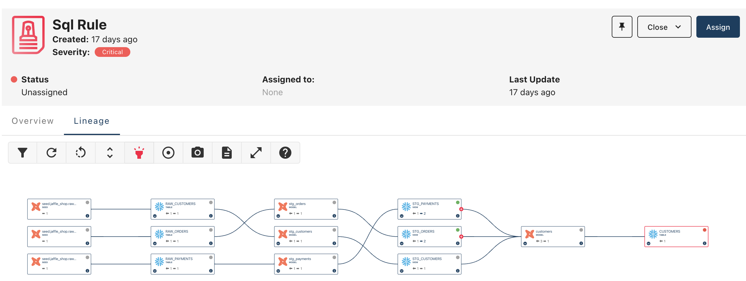 - Find the Root Cause with Lineage: Navigate to the Lineage tab. This is your most powerful tool for troubleshooting. The lineage view provides an end-to-end map of your data pipelines. Look upstream from the affected asset(s) to identify potential root causes—perhaps a transformation job failed, or an upstream table has its own quality issues.