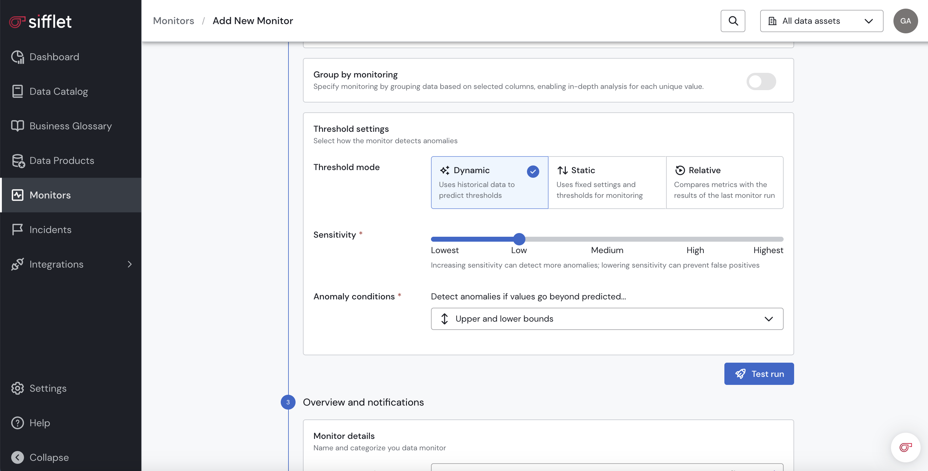 Monitor Sensitivity parameter setting is available in the Sifflet Monitor Wizard.