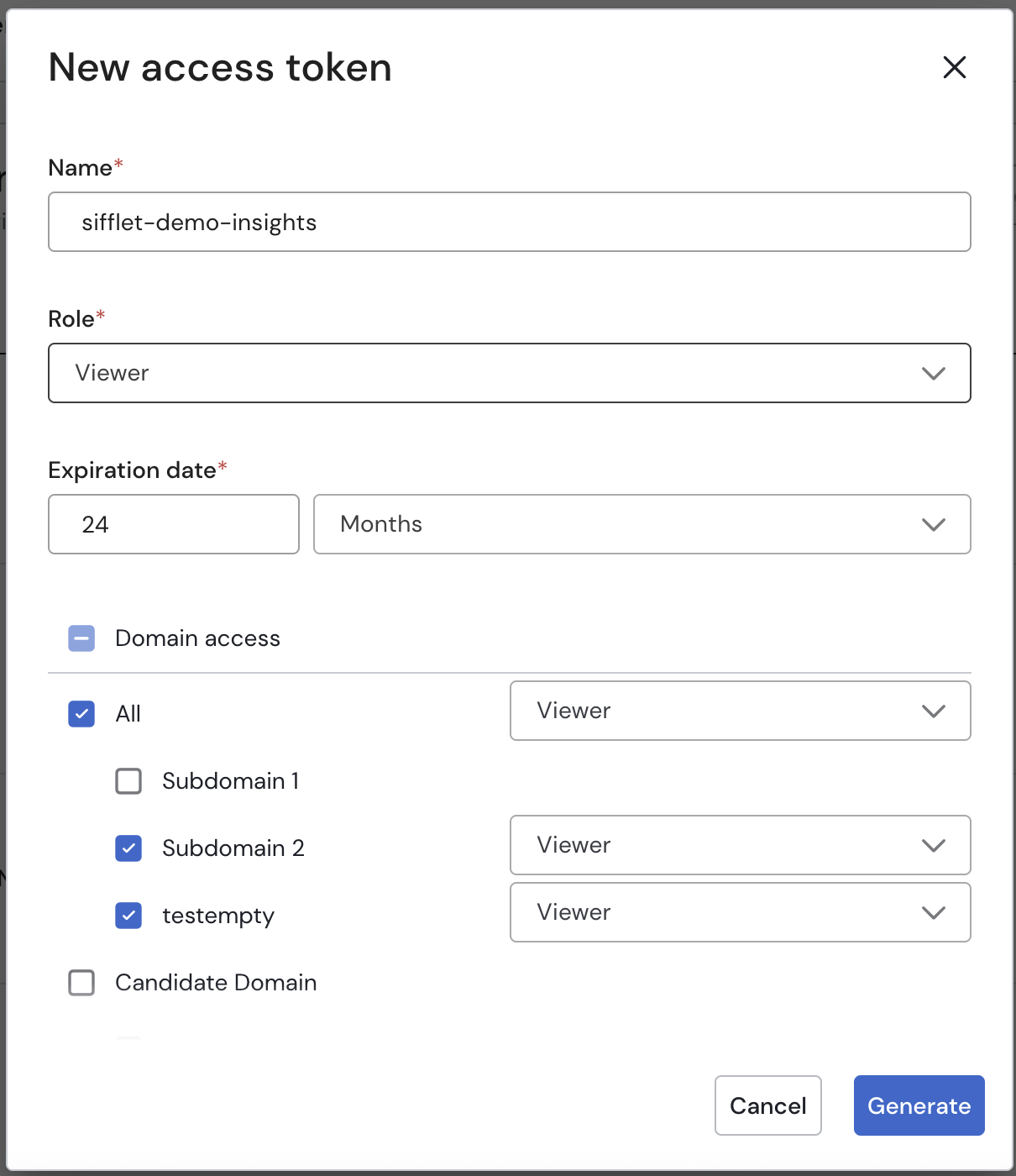 - Select the domains the token should apply to and assign a domain role for each . We recommend assigning the Viewer role for better security practices.