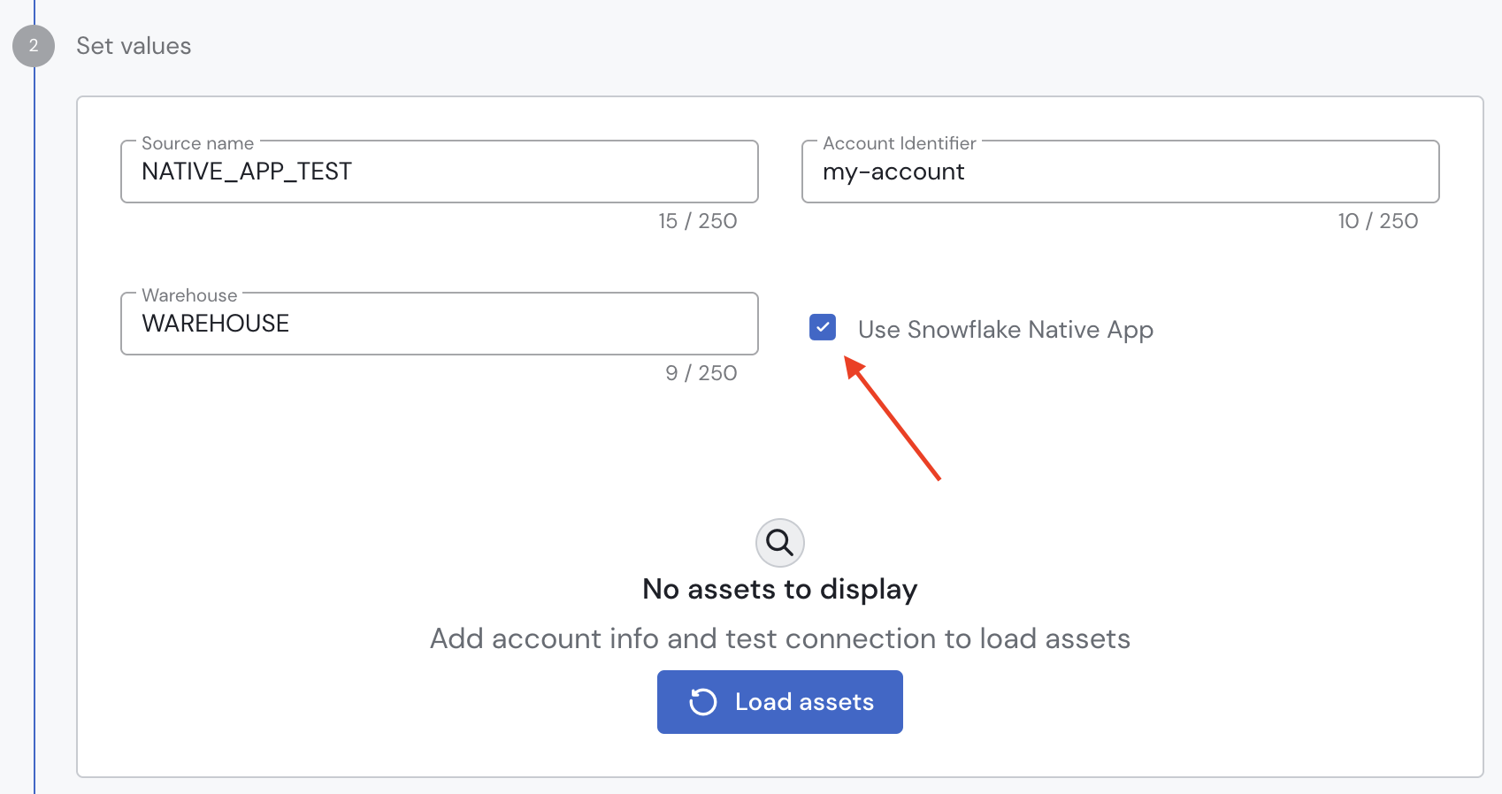 Check the Use Snowflake Native App option to use the Native App. Note that when using the Sifflet Native App, you do not need to provide any credentials: the Snowflake OAuth Token provided to the container running the app will be used.